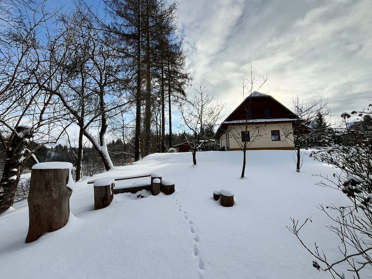 Velmi prostorná chalupa se nachází na soukromém pozemku se zahradou, vlastním venkovním posezením a uzamykatelným zahradním domkem, kde se v létě dají uschovat kola a v zimě lyže.